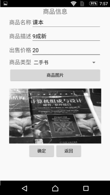 (9)发布商品:用户在登录成功后,从左侧滑出侧边菜单,单击“发布商品”按钮,进入商品发布页面。在商品发布页面填写商品名称、商品描述、期望价格,选择商品类别,上传1张照片,完成后单击“确认发布”按钮(见图12-107)。