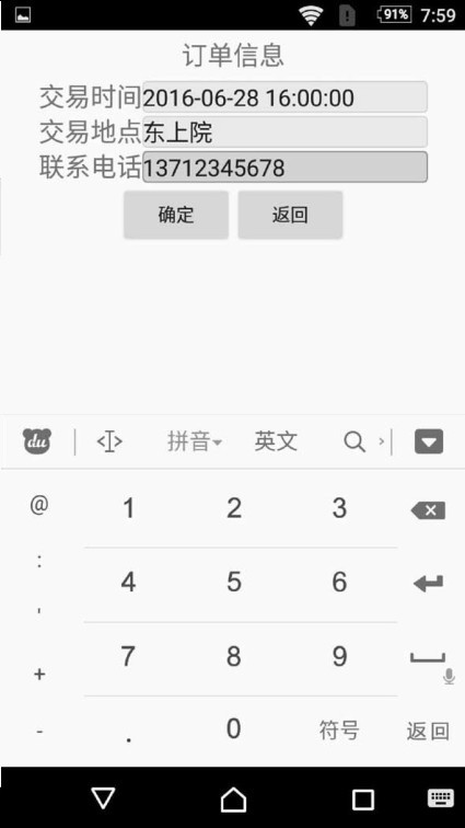 (8)创建订单:在商品详情页面,单击立即购买,进入创建订单页面。在该页面输入框中输入交易时间、交易地点、联系方式等信息,单击创建订单,即创建一个订单(见图12-106)。