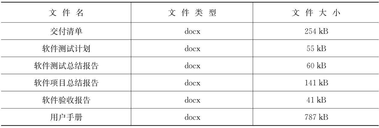 本文档包括文档清单和软件清单两部分。文档清单列出所交付的各种文档及对应的文件名。软件清单列出各个软件模块、对应的文件名及其大小。两部分互为补充和对照,共同呈现本软件的交付物。