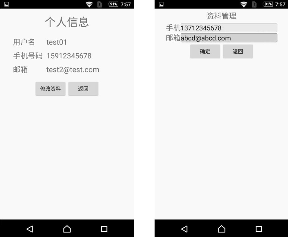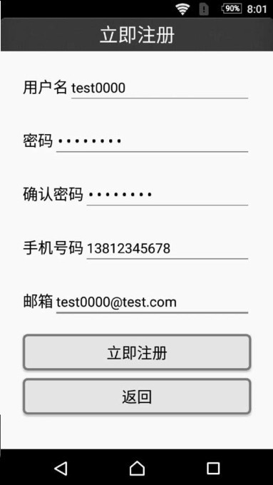 (2)注册:打开App,单击取消按键,在新的界面中的输入框输入用户名、密码、确认密码、手机号码、联系方式、邮箱,单击注册按键(见图12-101)。