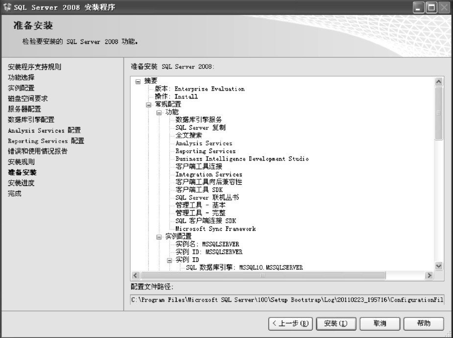 (16)进入“准备安装”界面,检查要安装SQL Server2008的功能,显示用户在安装过程中指定的安装选项树形图。单击“安装”按钮进行安装,如图1-21所示。