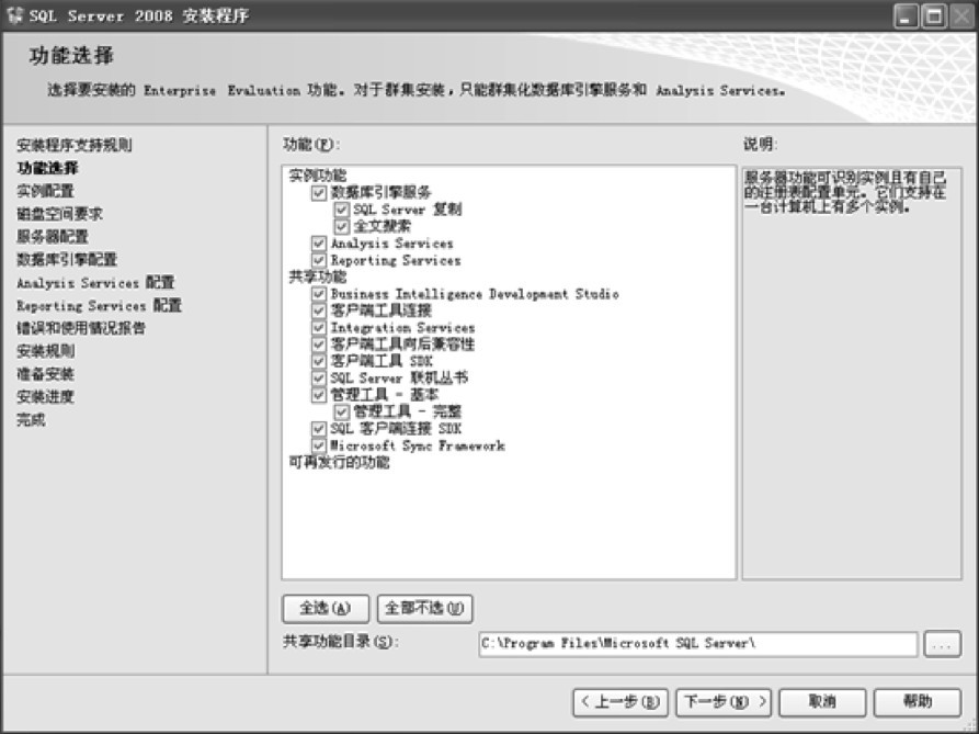 (7)进入“功能选择”界面,首先要根据应用的需要,选择安装的组件,本例选中功能列表框中的所有复选框,即单击“全选”按钮,然后在“共享功能目录”后的文本框中设置保存功能的路径,如图1-12所示,完成后单击“下一步”按钮。