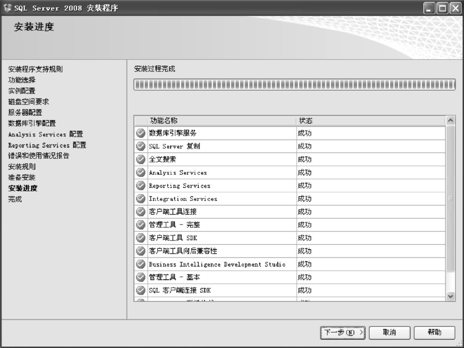 (18)安装过程完成后,将显示各安装组件的安装状态。若所需安装组件状态显示“成功”,则单击“下一步”按钮,如图1-23所示。