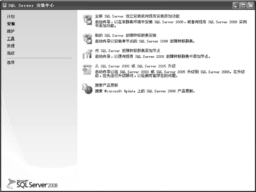 (1)系统重新启动后,再次双击SQL Server2008安装程序setup.exe文件,打开“SQL Server安装中心”窗口。选择左侧窗格中的“安装”选项,再单击右侧窗格中的“全新SQL Server独立安装或向现有安装添加功能”超链接,如图1-6所示。