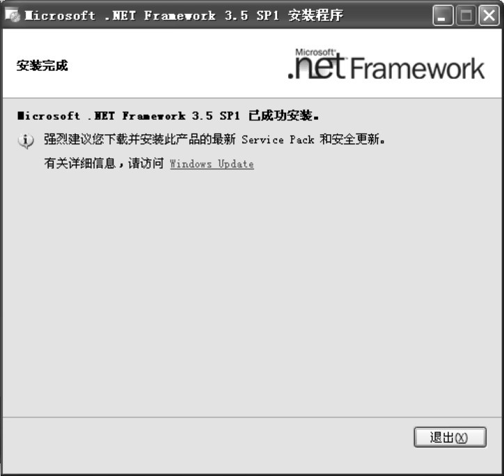 (3)系统开始安装Microsoft.NET Framework3.5SP1,进入“下载和安装进度”界面。安装完成后进入“安装完成”界面,如图1-3所示,单击“退出”按钮即可。