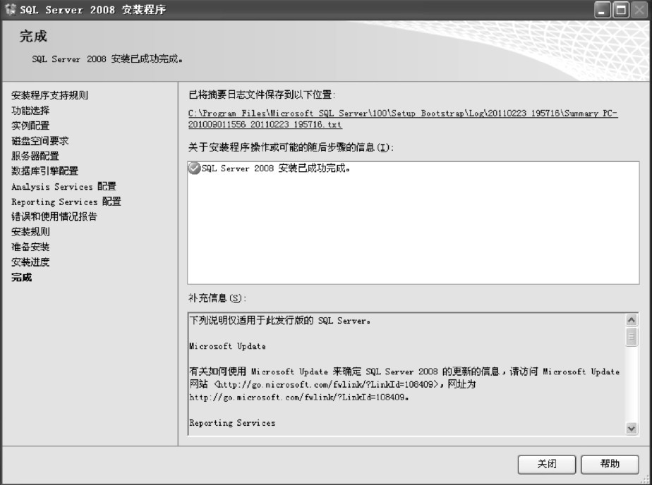 (19)进入“完成”界面,显示指向安装日志文件摘要及其他重要说明的链接,如图1-24所示。单击“关闭”按钮即可完成安装操作。