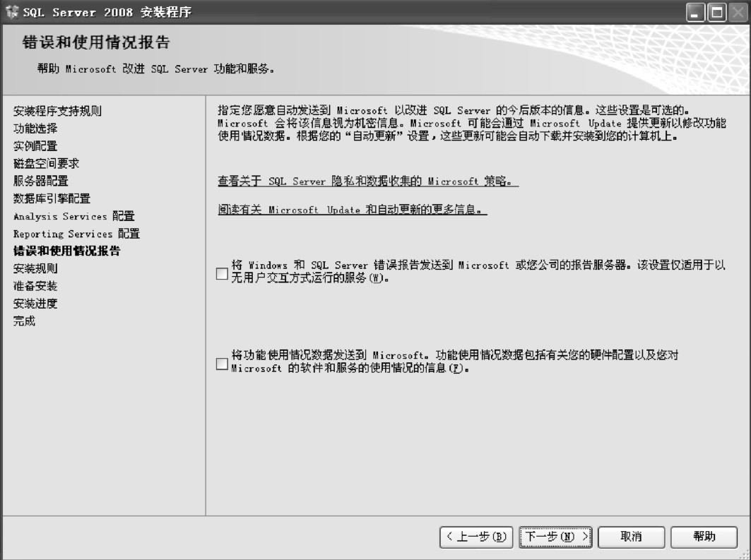 (14)进入“错误和使用情况报告”界面,帮助Microsoft改进SQL Server功能和服务。单击“下一步”按钮,如图1-19所示。