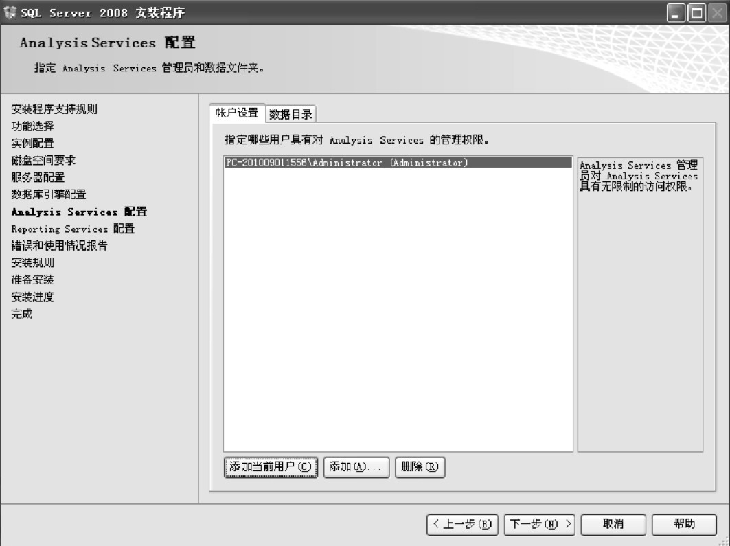 (12)进入“Analysis Services配置”界面,进行“账户设置”操作,指定哪些用户具有对Analysis Services的管理权限。选择“账户设置”选项卡,单击“添加当前用户”按钮为Analysis Services至少指定一个系统管理员,如图1-17所示。