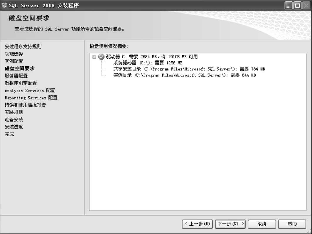 (9)单击“下一步”按钮,进入“磁盘空间要求”界面,此时系统计算安装盘所剩的空间,再与安装程序所需的空间进行比较,如图1-14所示。如果磁盘空间不够,则单击“上一步”按钮,返回前面的窗口,可将如图1-12所示的窗口底部的共享功能目录或如图1-13所示的窗口中的实例根目录设置为其他路径继续安装,然后单击“下一步”按钮。