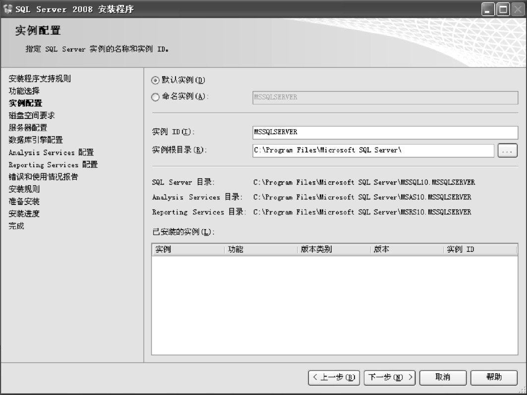 (8)进入“实例配置”界面,选择“默认实例”或“命名实例”选项。安装程序会先检测系统中已安装的SQL Server实例,并显示在“已安装的实例”列表框中。如果系统中只安装了一个SQL Server版本,通常就采用默认实例;如果系统中同时安装有其他SQL Server版本,则必须对实例进行命名。本例采用默认实例,如图1-13所示。