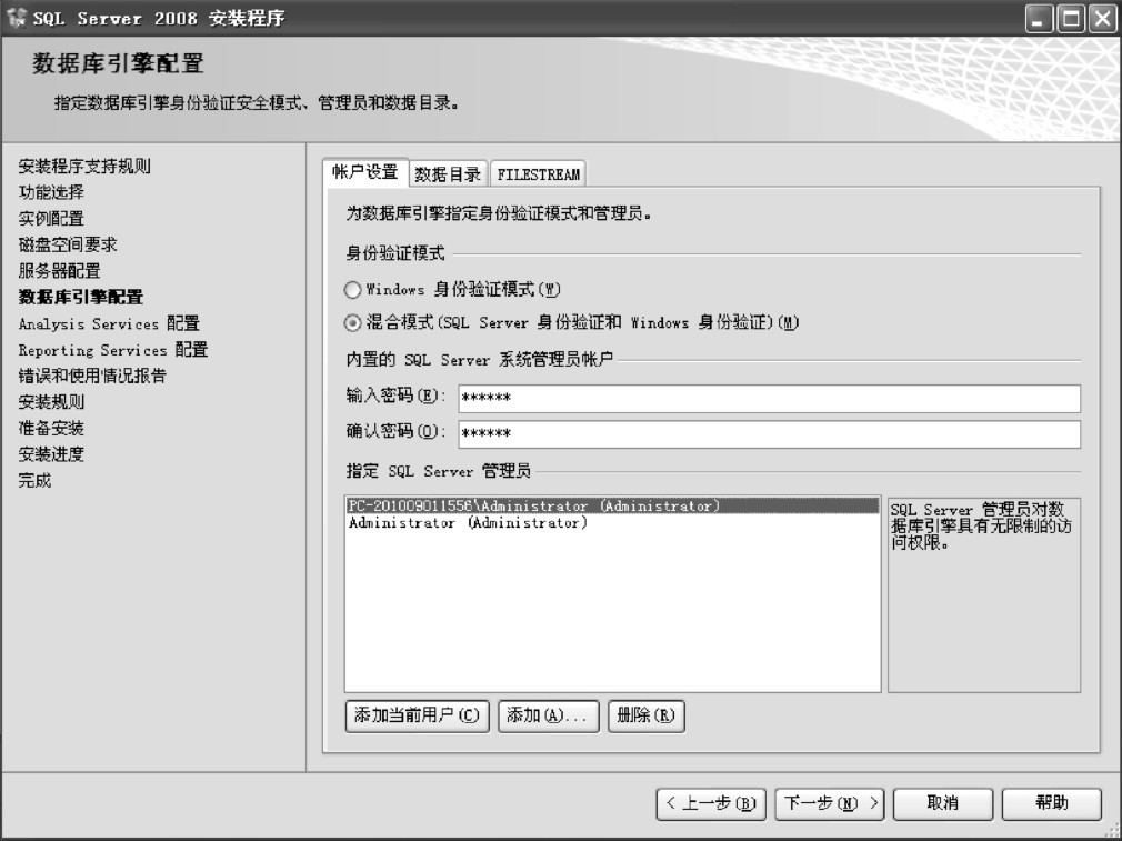 ●身份验证模式:SQL Server2008中数据库引擎身份模式有“Windows身份验证”和“混合模式”两种。如果选择“混合模式”单选按钮,则必须为内置的SQL Server系统管理员账户提供一个强密码。在设备与SQL Server成功建立连接之后,用于Windows身份验证和混合模式身份验证的安全机制几乎是相同的。本例选择“混合模式”单选按钮。