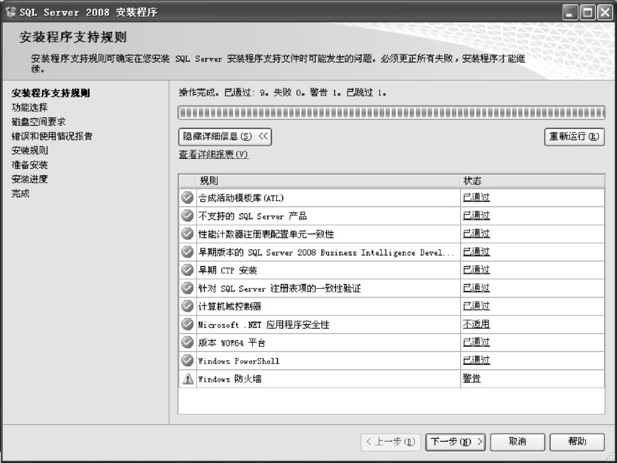 (15)进入“安装规则”界面,安装程序运行规则以确定是否将阻止安装过程。验证规则后显示相关提示,待验证通过后,单击“下一步”按钮,如图1-20所示。