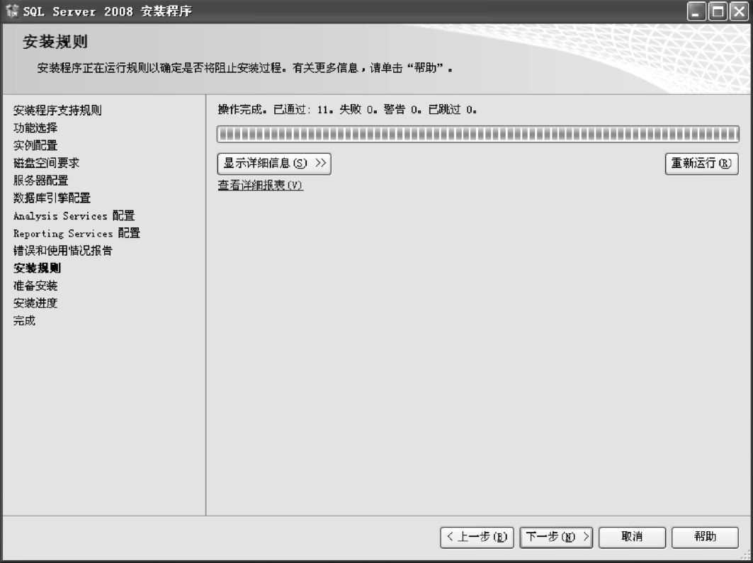 (6)进入安装过程,显示“安装程序支持规则”内容。系统配置检查器将在安装之前检测计算机的系统状态。检测完成后单击“下一步”按钮,如图1-11所示。