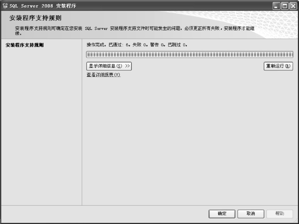 (2)进入“安装程序支持规则”界面,在安装SQL Server期间可能会发生一些问题。必须更正所有失败,安装才能继续,如图1-7所示,单击“确定”按钮。