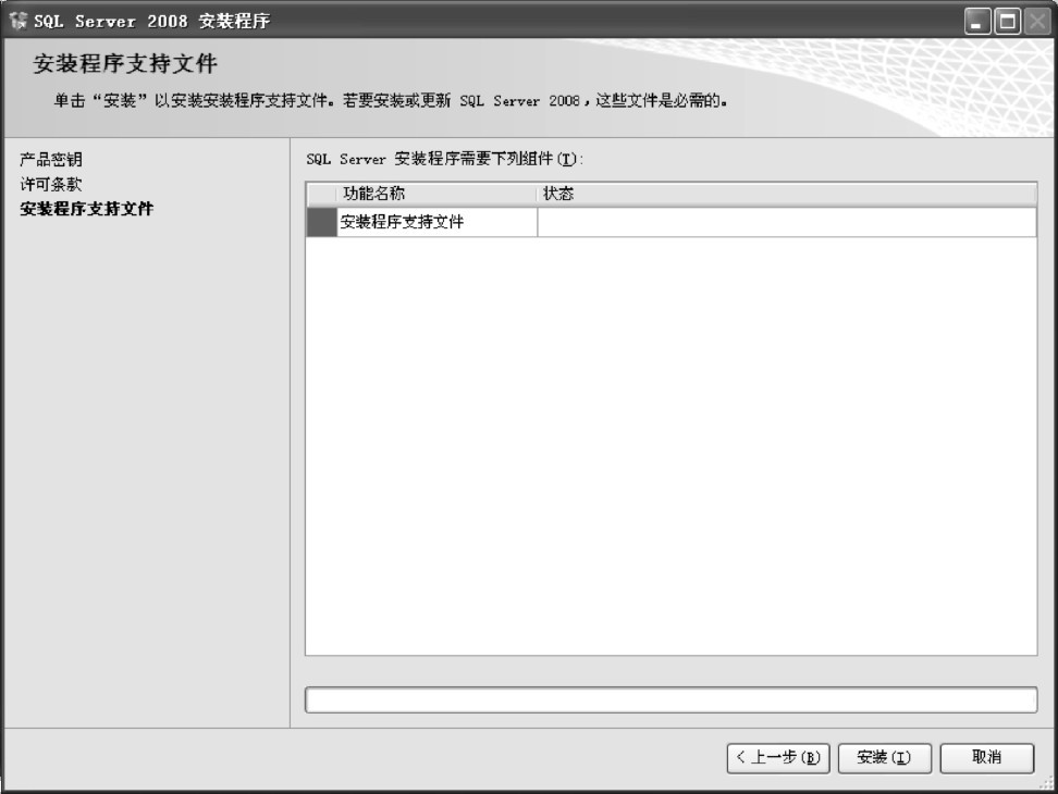 (5)进入“安装程序支持文件”界面,如果计算机上没有安装SQL Server的必备组件,安装向导将会提示安装。这些必备组件包括.NETFramework2.0、SQL Server Native Client和SQL Server安装程序支持文件等,如图1-10所示,单击“安装”按钮。