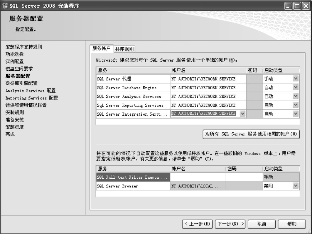 (10)进入“服务器配置”界面,选择“服务账户”选项卡,对SQL Server服务进行配置。每个服务可以配置相同的登录账户,也可以配置不同的账户,在“启动类型”列中可以选择手动和自动两种。建议对各个服务账户进行单独配置,以便为每项服务提供最低特权,也就是向SQL Server服务授予他们完成各自任务所需的最低权限。为了方便初学者安装并使用,本例对所有的服务都选择NETWORKSERVICE,对排序规则不作更改,如图1-15所示。