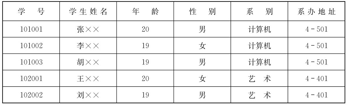 学生表:Student(学号,学生姓名,年龄,性别,系别,系办地址),如表2-3所示。