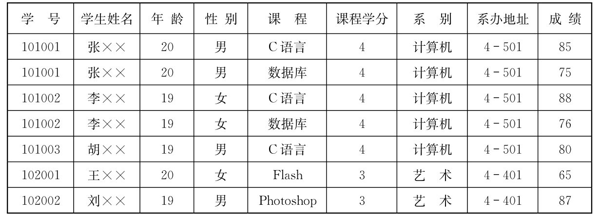 如学生信息系统,把所有这些信息放到一个表中(学号,学生姓名,年龄,性别,课程,课程学分,系别,系办地址,成绩),如表2-2所示。