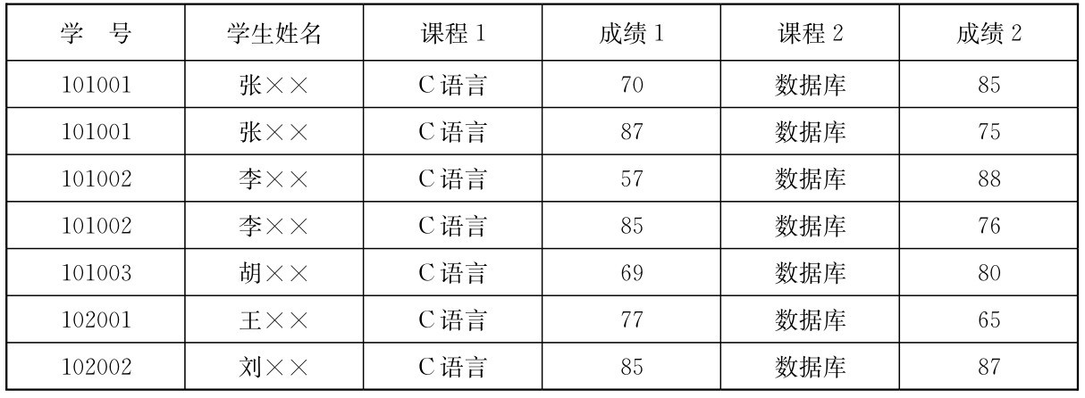 在表2-1所示的学生成绩表中出现了重复的属性,“课程1”和“课程2”是相同的字段,都是课程名,“成绩1”和“成绩2”也是相同的字段,应该把“课程1”和“课程2”合并成一个字段,“成绩1”和“成绩2”合并成一个字段,使其满足第一范式。