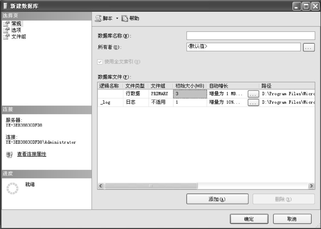 在“数据库名称”文本框中输入新建数据库的名称Student,数据库名称设置完成后,系统自动在“数据库文件”列表中产生一个主数据文件(名称为Student.mdf,初始大小为3MB)和一个日志文件(名称为Student_log.ldf,初始大小为1MB),同时显示文件组、自动增长和路径等默认设置。用户可以根据需要自行修改这些默认的设置;也可以单击“添加”按钮添加数据文件。
