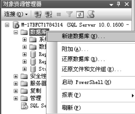 (2)在打开的MicrosofT-SQL Server Management Studio窗口的左窗格“对象资源管理器”中右键单击“数据库”节点,在弹出的快捷菜单中执行“新建数据库”命令,如图3-2所示。