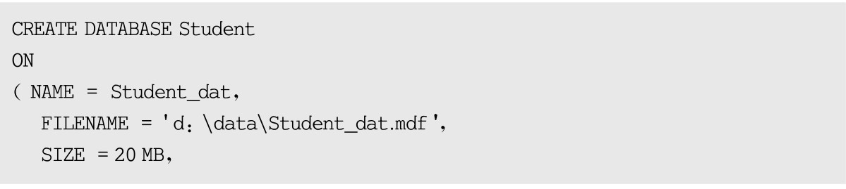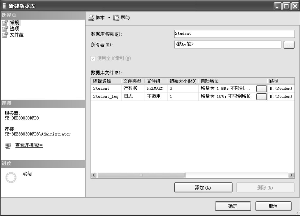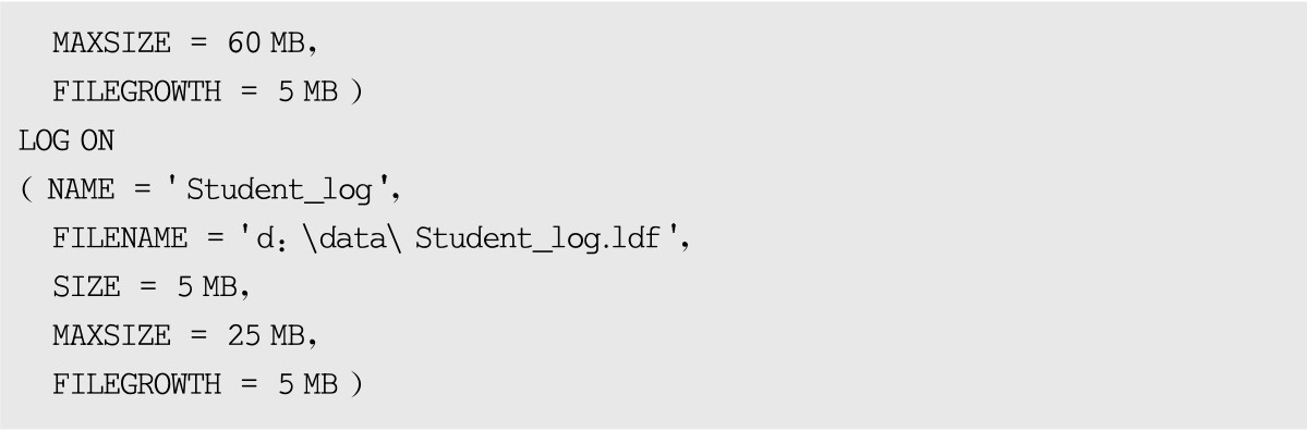 按钮执行以上TSQL代码,可在完成数据库Student创建的同时,对其数据库文件和日志文件的属性进行设置。