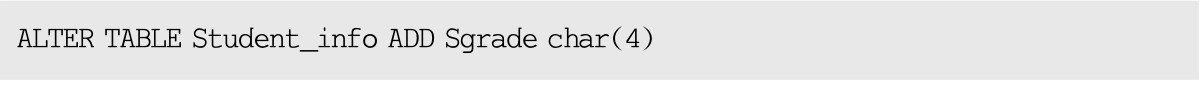【例4-5】由于需要了解学生所在的年级,因此,需要在Student_info表中添加Sgrade字段,其类型为char,长度为4。