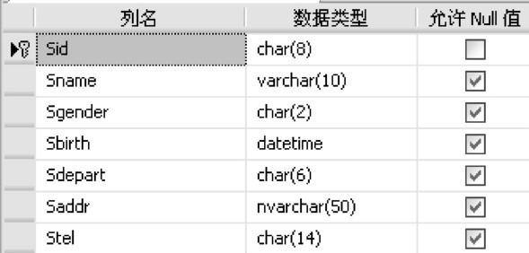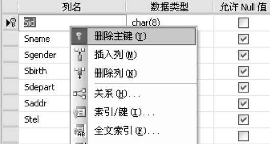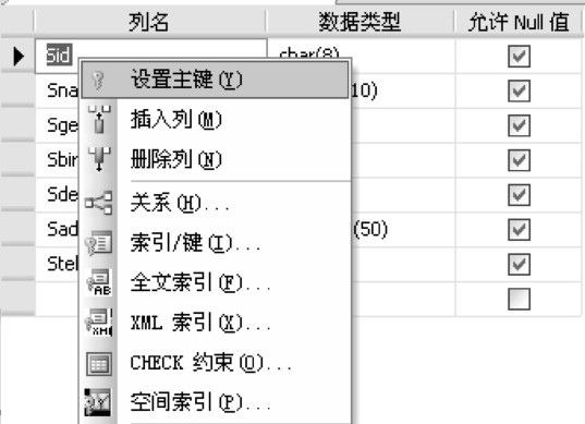 (2)在打开窗口的右上部分,右键单击要设置的PRIMARYKEY列,如Sid,在弹出的快捷菜单中执行“设置主键”命令,如图4-24所示。