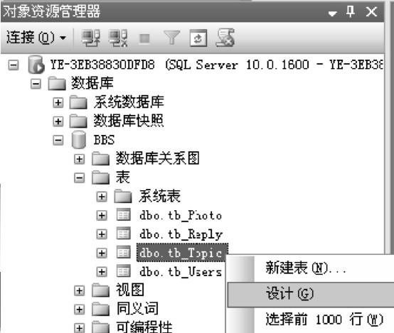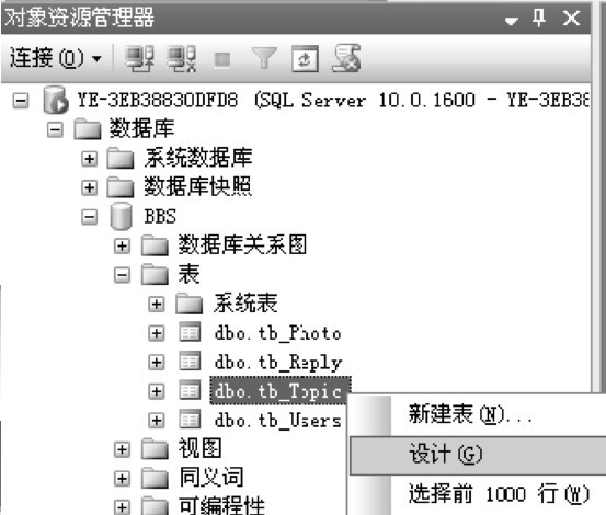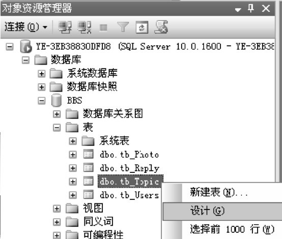 步骤1:启动SQL Server Management Studio,在其“对象资源管理器”窗格中依次展开“数据库”节点、BBS节点和“表”节点,在dbo.tb_Topic上单击鼠标右键,在弹出的快捷菜单中执行“设计”命令,如图4-57所示。