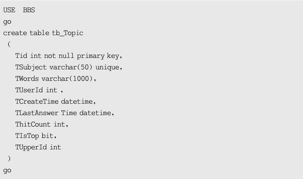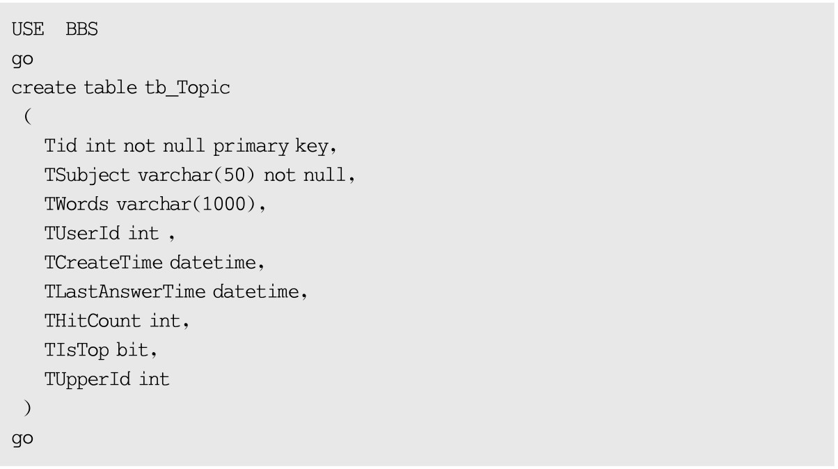 按钮来执行以上T-SQL代码,完成发帖信息表(tb_Topic)非空性约束的设置。