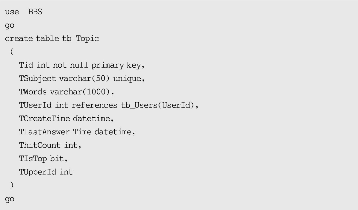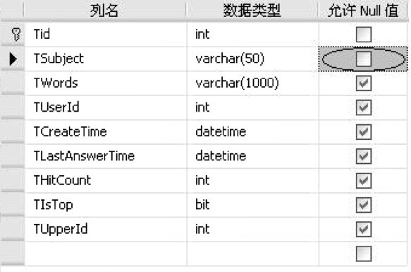 (2)由于在发帖信息表(tb_Topic)中,要求帖子标题(TSubject)不能为空,需要将帖子标题设置为该表的非空性约束;