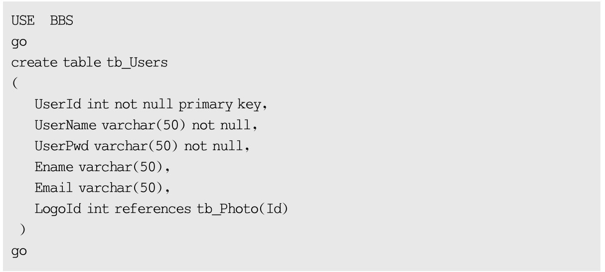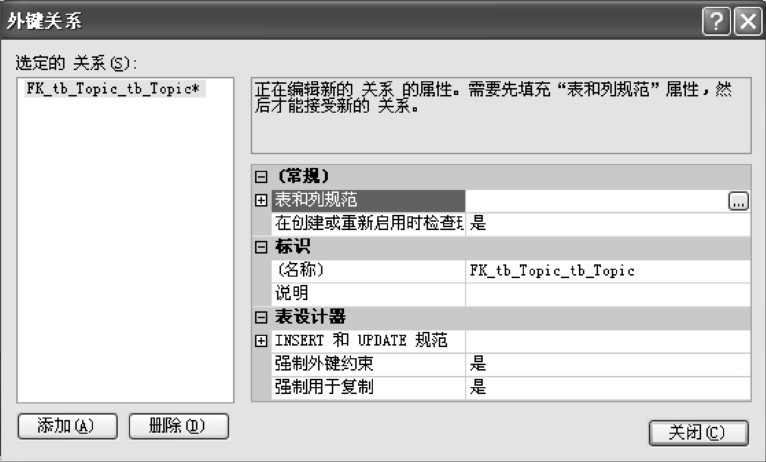 按钮来执行以上T-SQL代码命令,完成发帖信息表(tb_Topic)外键约束的设置。