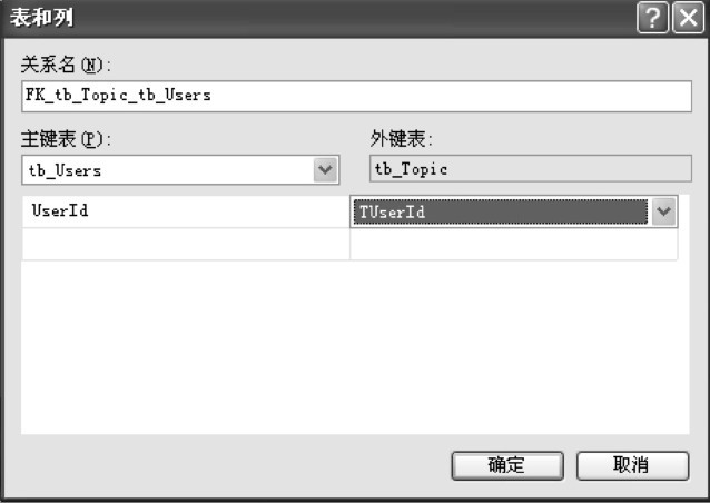 按钮,弹出“表和列”对话框,选择要建立关系的主键表tb_Users以及两个表中对应的列User Id和TUser Id,完成后单击“确定”按钮,如图460所示。