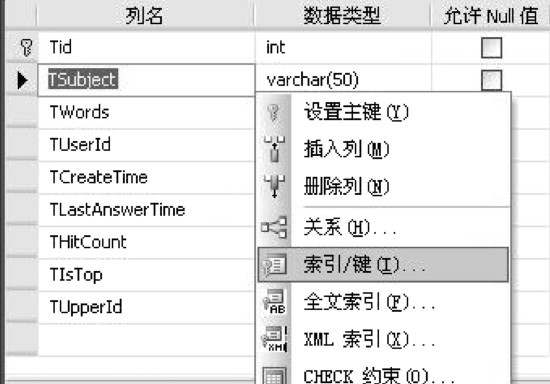 步骤2:在打开窗口的右上部分,右键单击要设置唯一键的列,如TSubject,在弹出的快捷菜单中执行“索引/键”命令,如图4-49所示。