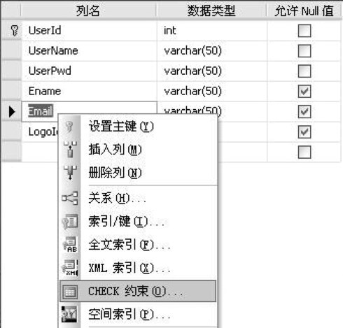 步骤2:在打开窗口的右上部分,鼠标右键单击字段Email,在弹出的快捷菜单中执行“CHECK约束”命令,如图4-53所示。