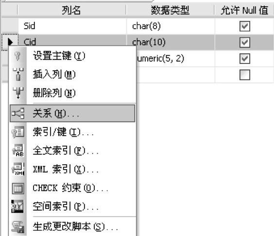 (2)在打开窗口的右上部分,鼠标右键单击字段Cid,在弹出的快捷菜单中执行“关系”命令,如图4-40所示。