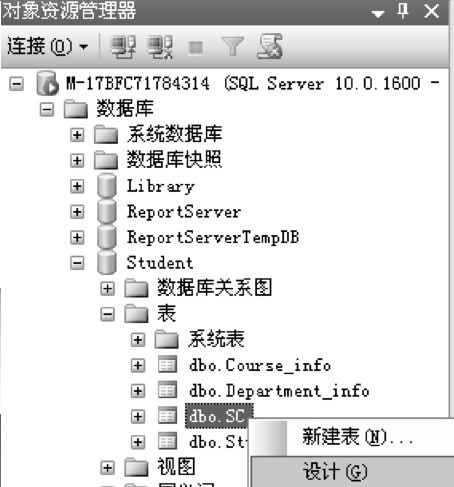 (1)启动SQL Server Management Studio,在其“对象资源管理器”窗格中依次展开“数据库”节点、Student节点和“表”节点,在dbo.SC上单击鼠标右键,在弹出的快捷菜单中执行“设计”命令,如图4-39所示。