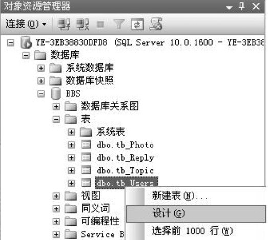 步骤1:启动SQL Server Management Studio,在其“对象资源管理器”窗格中依次展开“数据库”节点、BBS节点和“表”节点,在dbo.tb_Users上单击鼠标右键,在弹出的快捷菜单中执行“设计”命令,如图4-55所示。