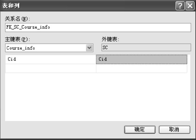 按钮,弹出“表和列”对话框,选择要建立关系的主键表Course_info以及两个表中对应的列Cid,设置完成后单击“确定”按钮,如图442所示。