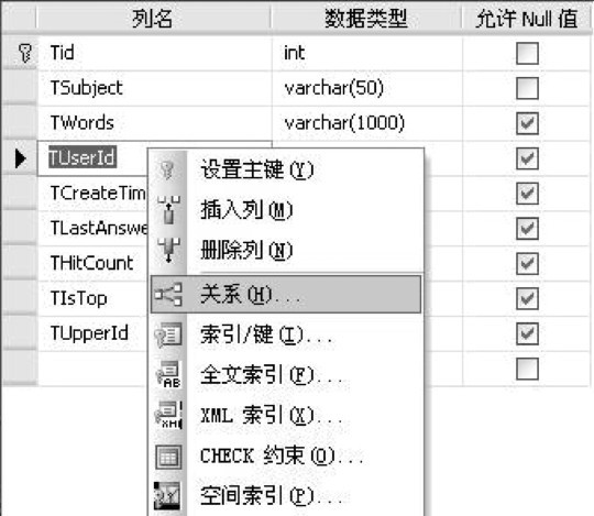 (6)由于在发帖信息表(tb_Topic)中,要求发帖人编号(Tuser Id)必须为已有的用户信息表(tb_Users)中的用户编号,需要将发帖人编号设置为该表的外键约束。
