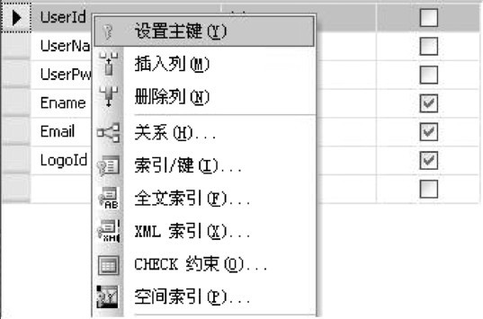 步骤2:在打开窗口的右上部分,右键单击要设置PRIMARYKEY的列,如User Id,在弹出的快捷菜单中执行“设置主键”命令,如图4-44所示。