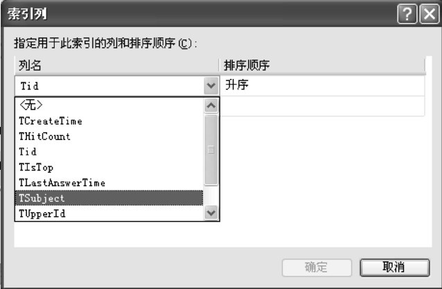 按钮,弹出“索引列”对话框,在“列名”的下拉列表中选择要设置唯一键的TSubject字段,如图451所示,单击“确定”按钮。