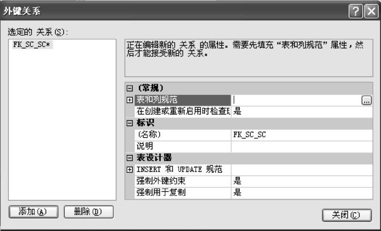 (3)打开“外键关系”对话框,单击“添加”按钮,然后选择右侧列表框中的“表和列规范”选项,该选项右边弹出