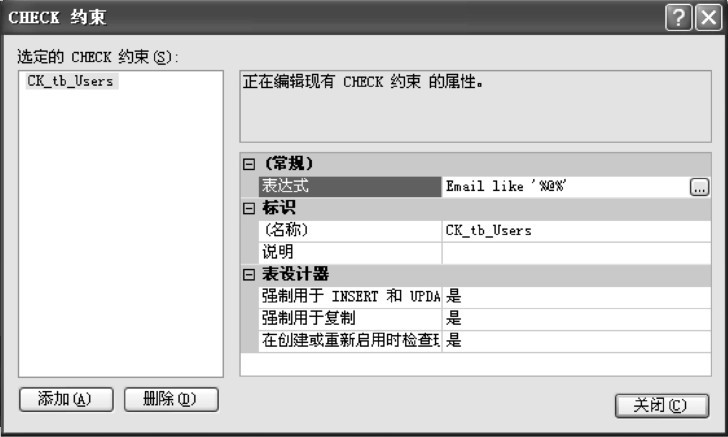 步骤3:打开“CHECK约束”对话框,单击“添加”按钮,在右侧列表框的表达式中输入“Emaillike%@%”,单击“关闭”按钮,如图4-54所示。