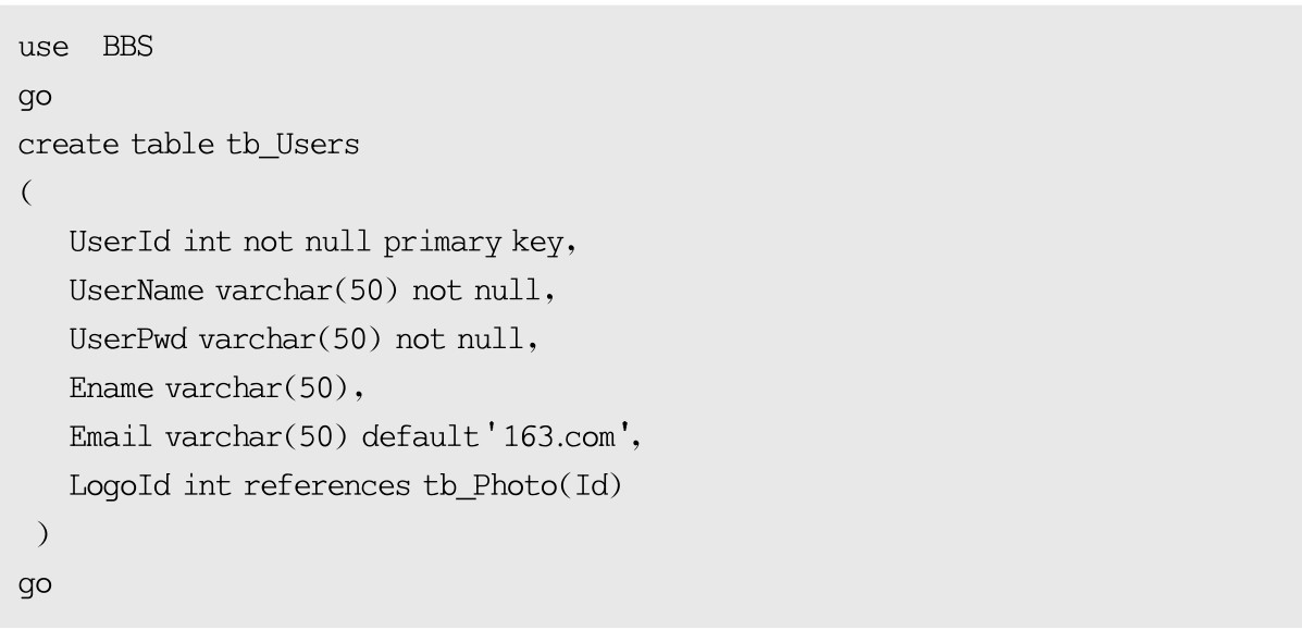 按钮来执行以上T-SQL代码,完成用户信息表(tb_Users)默认值约束的设置。
