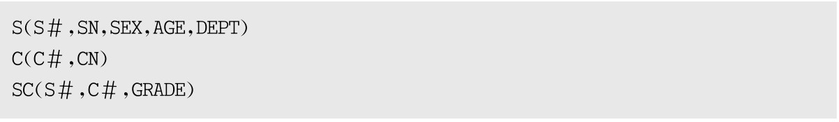 其中:S#为学号,SN为姓名,SEX为性别,AGE为年龄,DEPT为系别,C#为课程号,CN为课程名,GRADE为成绩。