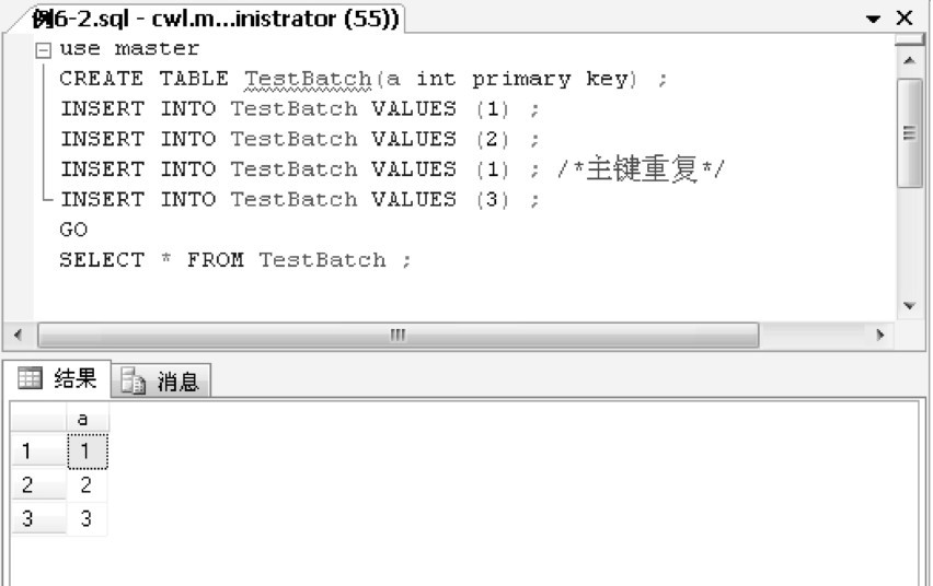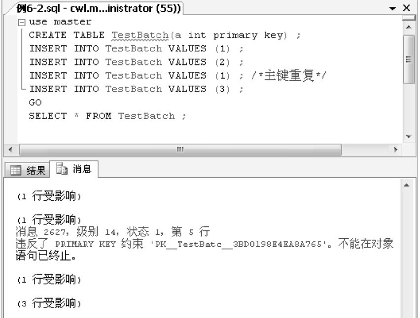 例6-2中的代码没有语法错误,可以建立执行计划。在执行过程中,由于第3个INSERT语句产生主键重复的错误,因此该语句停止执行,继续执行第4个INSERT语句。SELECT语句返回3个行,如图6-1和图6-2所示。
