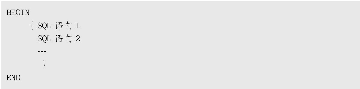 在BEGIN...END关键字之间封装一系列的SQL语句,就形成了一个语句块,从而可以执行一组SQL语句。BEGIN...END语句块允许嵌套。BEGIN...END的语法结构如下: