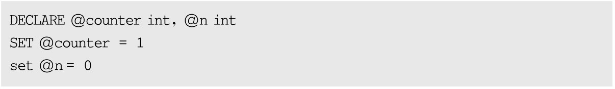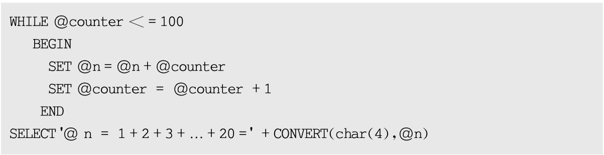 【例6-13】编写代码计算并显示@n=1+2+3+...+100。代码如下: