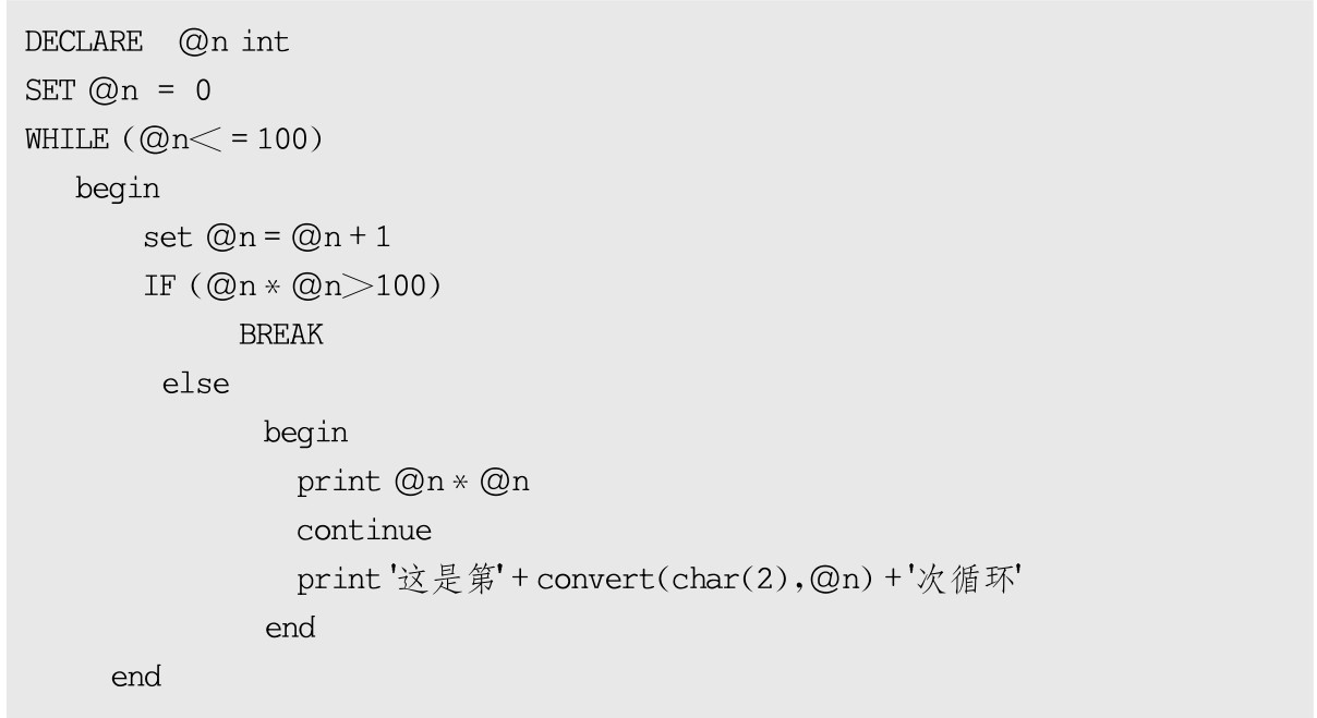 CONTINUE语句一般用在循环语句中,重新开始WHILE循环。在CONTINUE关键字之后的任何语句都将被忽略,重新转到下一次循环条件的判断。